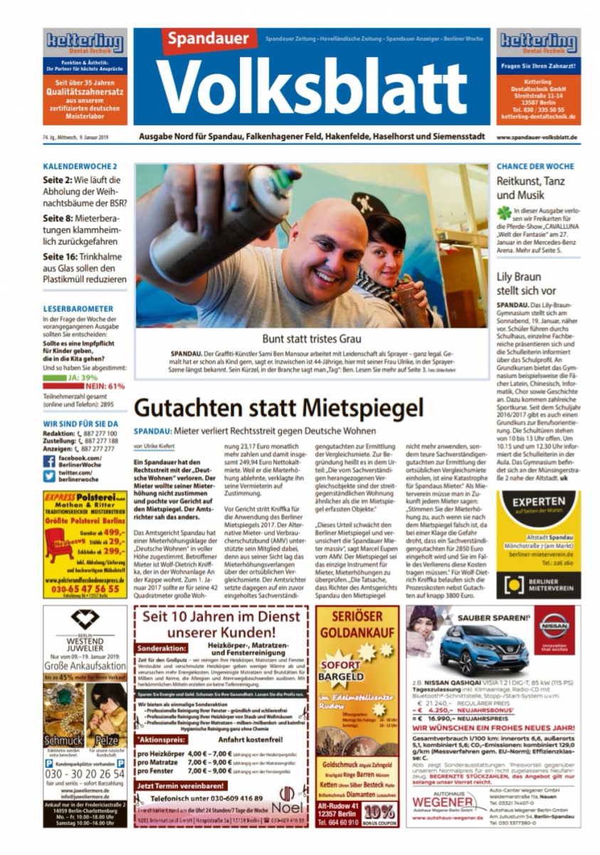 In der aktuellen Ausgabe vom 09. Januar 2019 finden Sie auf der Titelseite einen kleinen Einblicken in das Schaffen unseres 1. Vorsitzenden Ben Mansour und seiner Frau Ulrike Pflugbeil – Mansour.